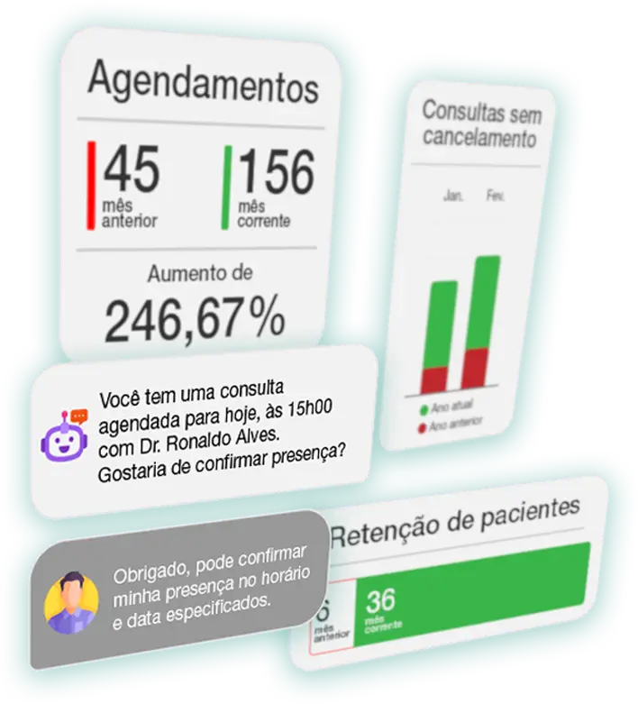 Transforme o caos da sua recepção em um fluxo de atendimento impecável, 24 horas por dia. Nossos agentes de inteligência artificial cuidam de tudo, desde agendamentos até o envio de exames, para que sua equipe foque no que realmente importa.